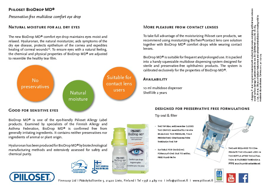 BioDrop MD® is suitable for frequent and prolonged use. It is packed into a handy multidose dispensing system (10 ml) designed for sterile and preservative-free ophthalmic products.
